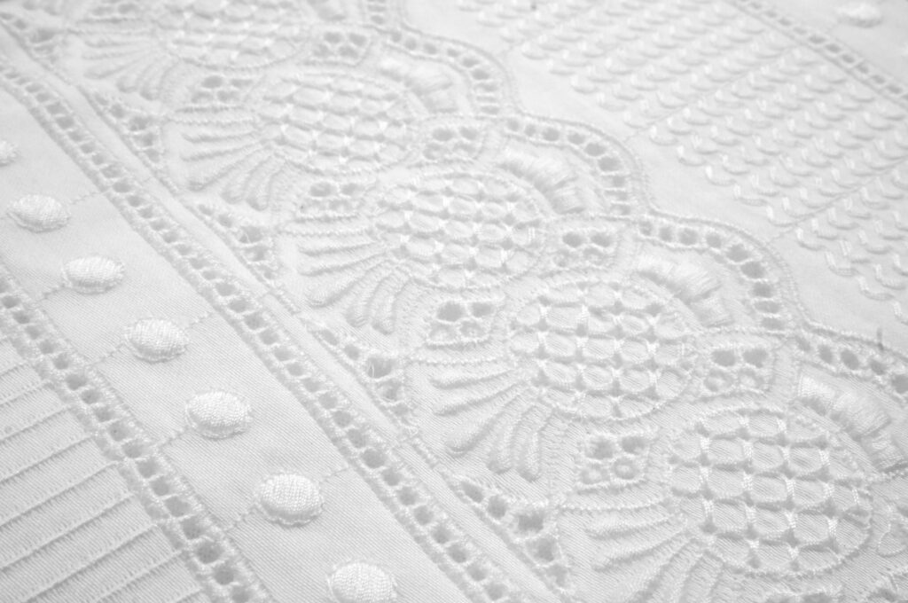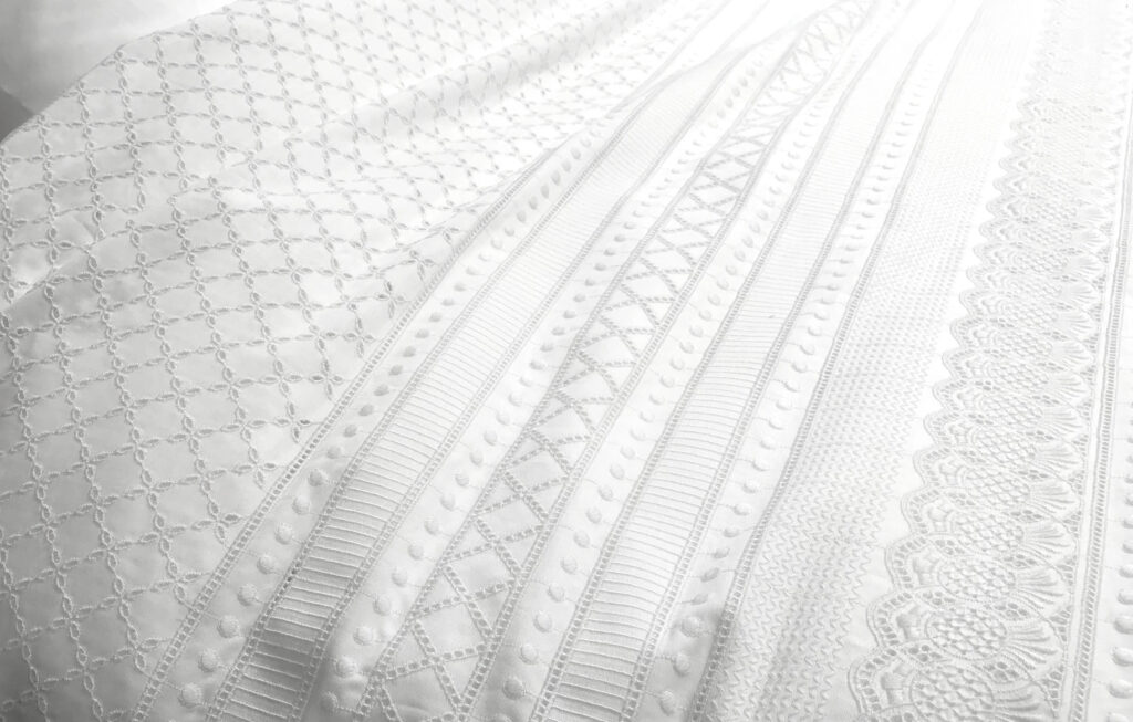 白という限られた条件のなかで、私たちがモチーフの手がかりとしたのは、ヨーロッパのアンティークリネンに見られる、「白糸刺繍」や「カットワーク」の、慎ましくも凛とした佇まいでした。