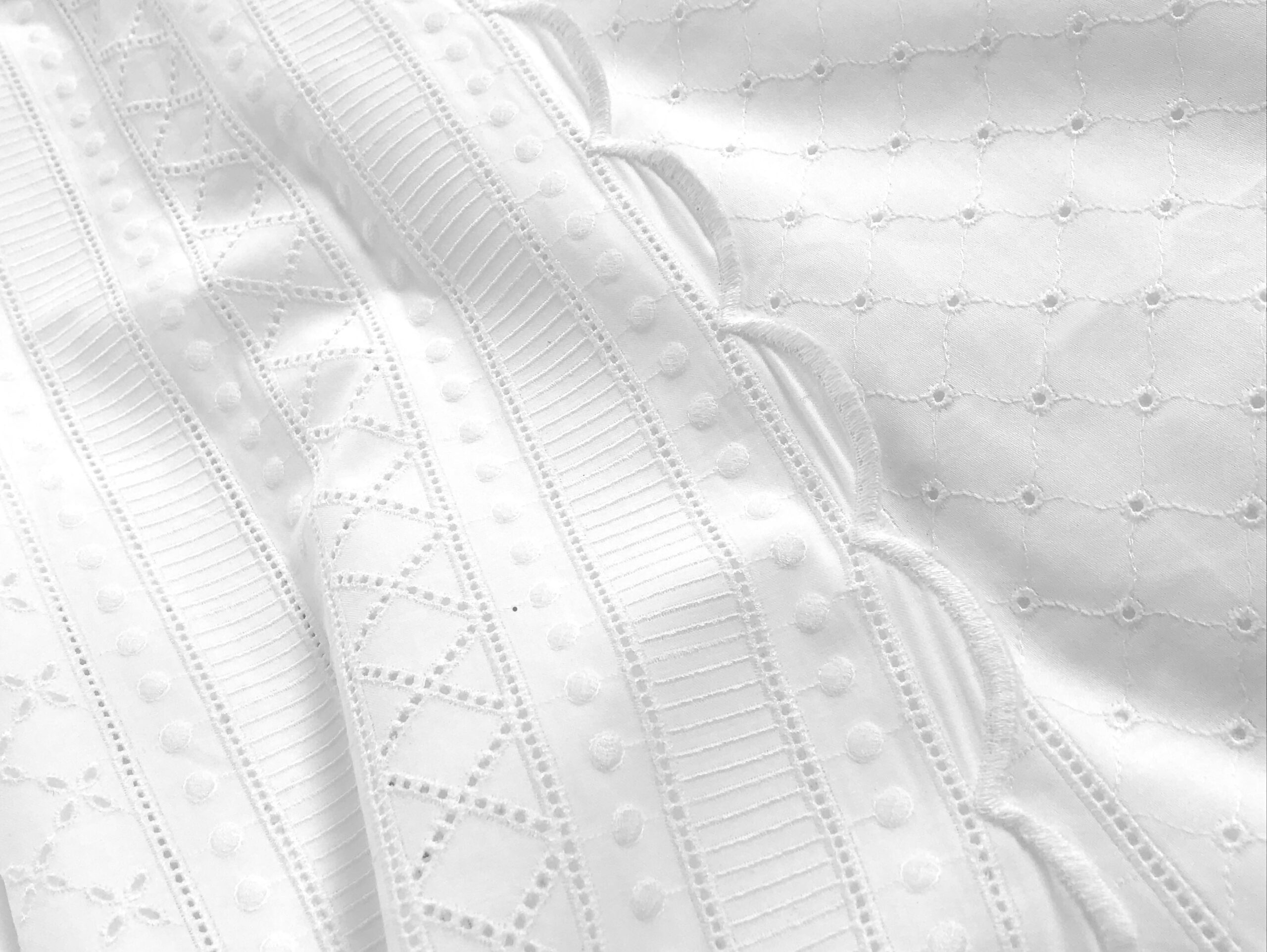 白という限られた条件のなかで、私たちがモチーフの手がかりとしたのは、ヨーロッパのアンティークリネンに見られる、「白糸刺繍」や「カットワーク」の、慎ましくも凛とした佇まいでした。